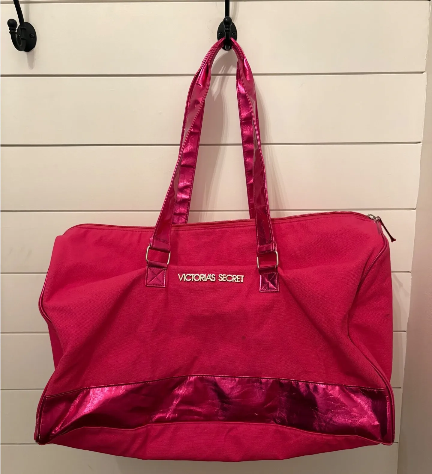 Keywords: Victoria's Secret, Pink Duffel Bag, Travel Bag, Gym Bag, Weekend Bag, Carry On, Metallic Trim, Women's Bag, Pink and Silver, Victoria Secret, VS, Pink Luggage, Pink Travel