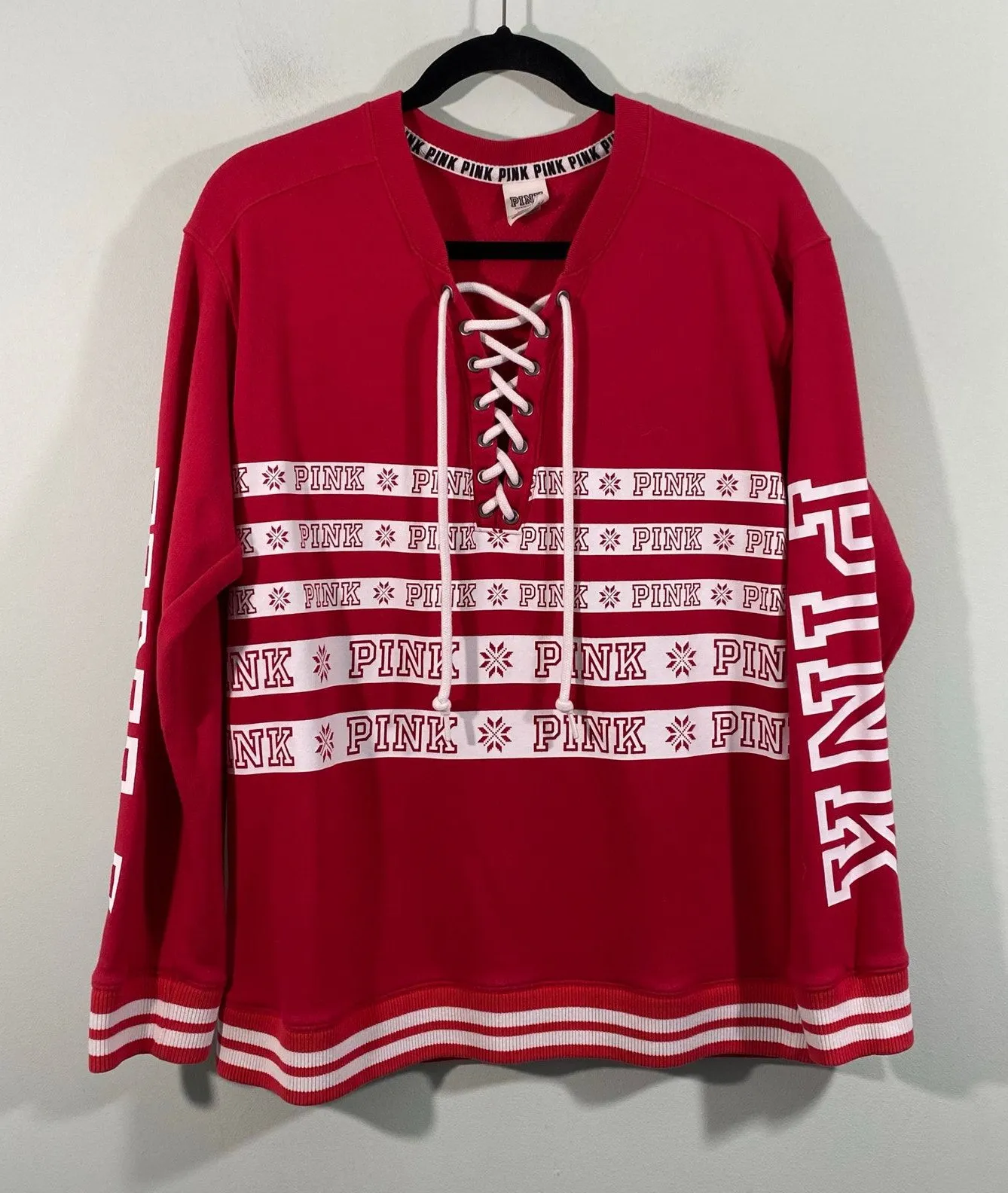 Victoria's Secret Pink Women Red Lace Up Hockey Sweatshirt - Size S - Good pre-owned condition - Measurements: armpit to armpit: 19.5, length: 27.5, sleeve length: 23 All measurements were taken with product flat lay Please refer to pictures for material content Feel free to contact me for more pictures or questions