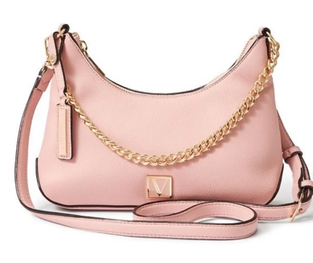 This elegant shoulder bag from Victoria's Secret features a soft pink hue with gold-tone accents, of... Show more