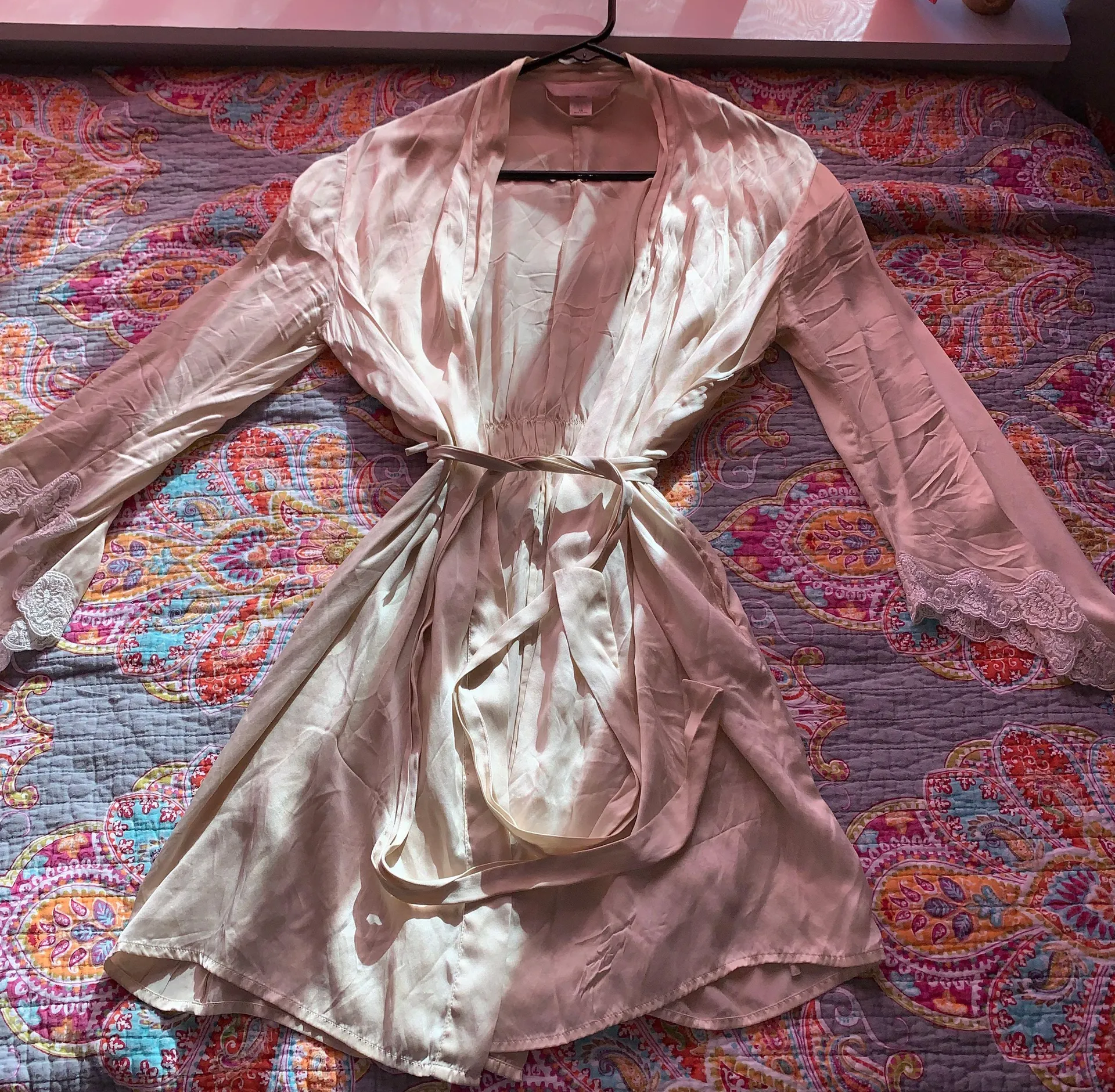 This is a sexy light pink silk robe. There is lace on the wrists of the sleeves. There is a tie arou... Show more