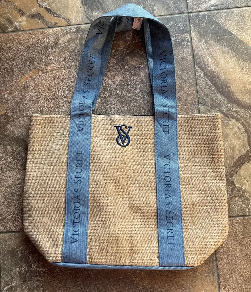 Victoria's Secret Straw Beach Tote Bag Large Weekender Travel Logo Blue‎ Beige Blue - $20 New With Tags - From Angela