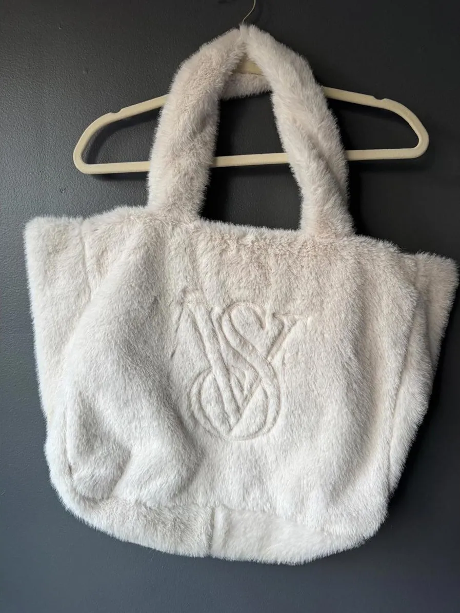 Soft and plush faux fur tote bag from Victoria's Secret. Features a large embossed VS logo on the fr... Show more