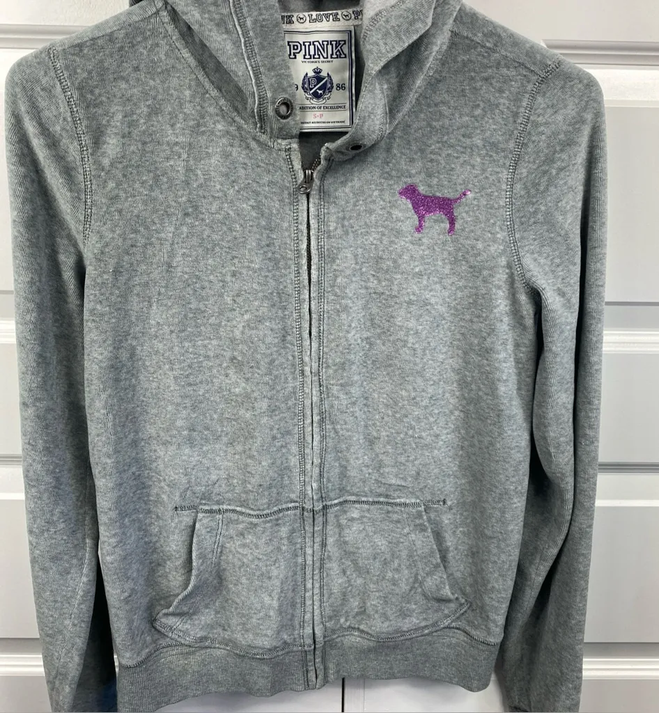 Victoria's Secret Velour Full-Zip Hoodie Jacket Gray Small SM Pink Dog glitter - $22 - From Cherrylyn