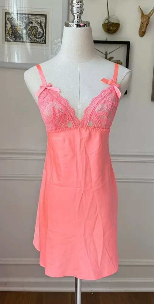 Victoria’s Secret two piece chemise and short cap sleeve robe in electric coral satin with lace trim... Show more