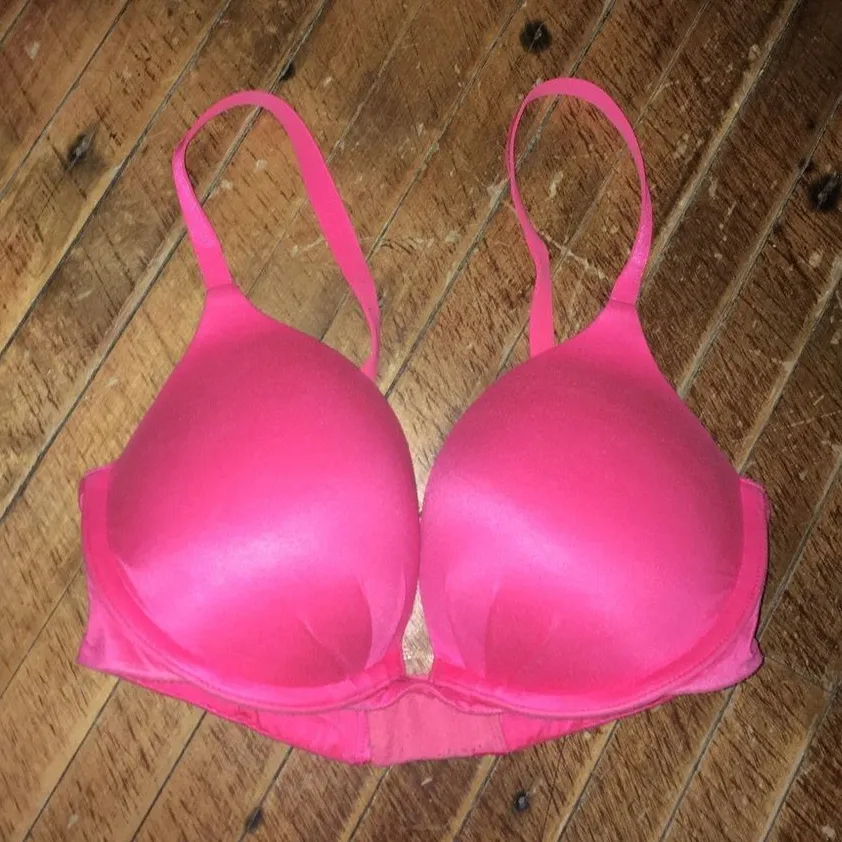 Victoria’s Secret barbiecore, silky, sexy, hot pink bra. Underwire. Padded. Some wear, fading, pilin... Show more