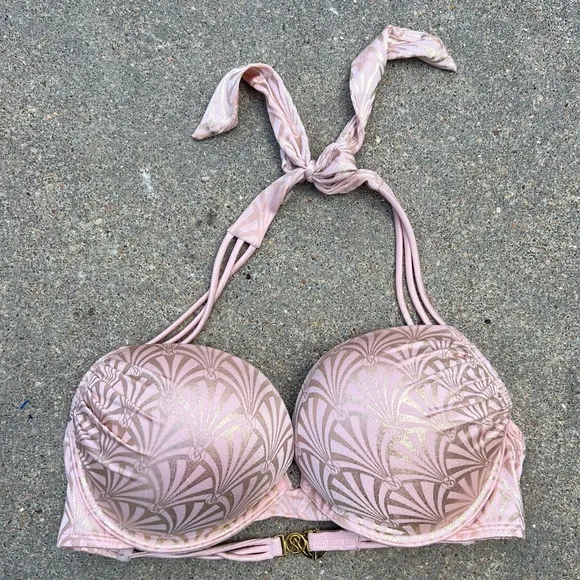 Victoria’s Secret Bombshell Pink Peach Gold Shell Foil Bikini Top 36C Gold tone clasp Halter tie nec... Show more