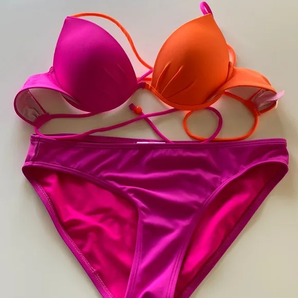 32B top, small bottoms (old navy) Hot pink and orange. Great condition. Padded bra top that ties. Us... Show more