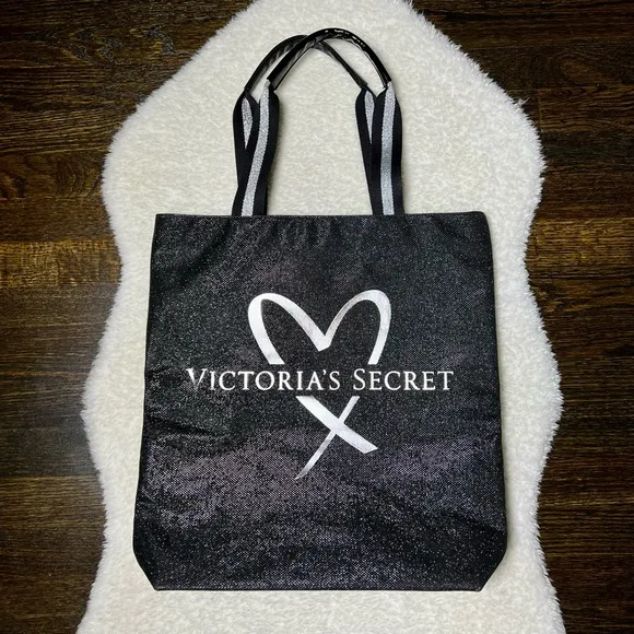 Preowned / used tote bag from Victoria’s Secret. Black glitter with silver canvas heart and Victoria... Show more