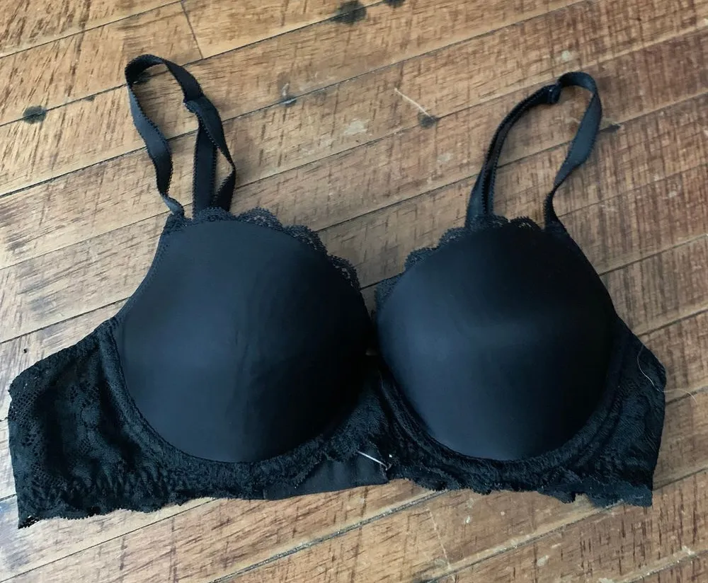 Victoria’s Secret black lace, lined Demi 34C bra. Lacy straps across the back. Minor wear, but overa... Show more
