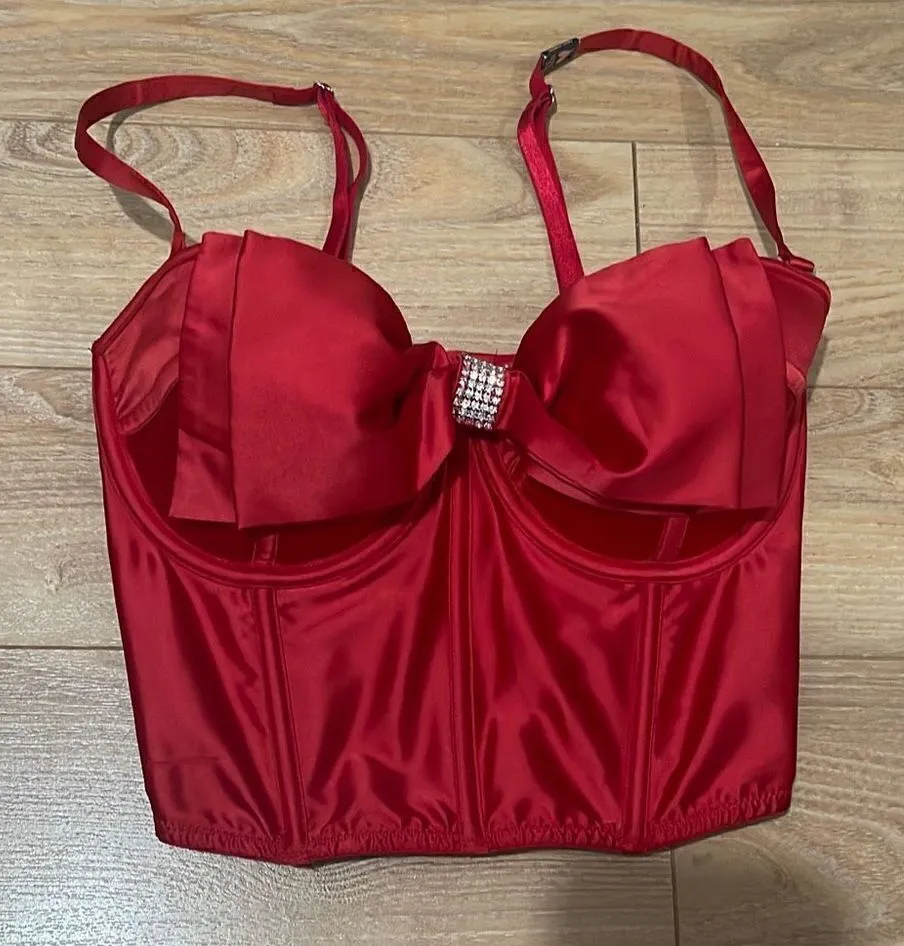 Victoria’s Secret Bra 32D Dream Angels Red Long Line Bling Bow Satin Removable Straps Super cute R... Show more
