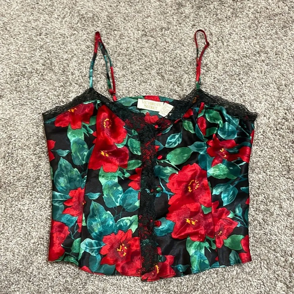 Lace trip and corset button front. Satin fabric Red flowers and green and black background Size sm... Show more