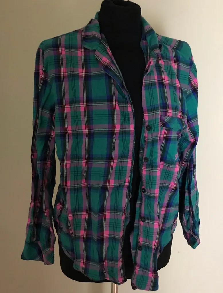 Stylish plaid button-up top for women. Features a vibrant mix of green and pink colors. Perfect for... Show more
