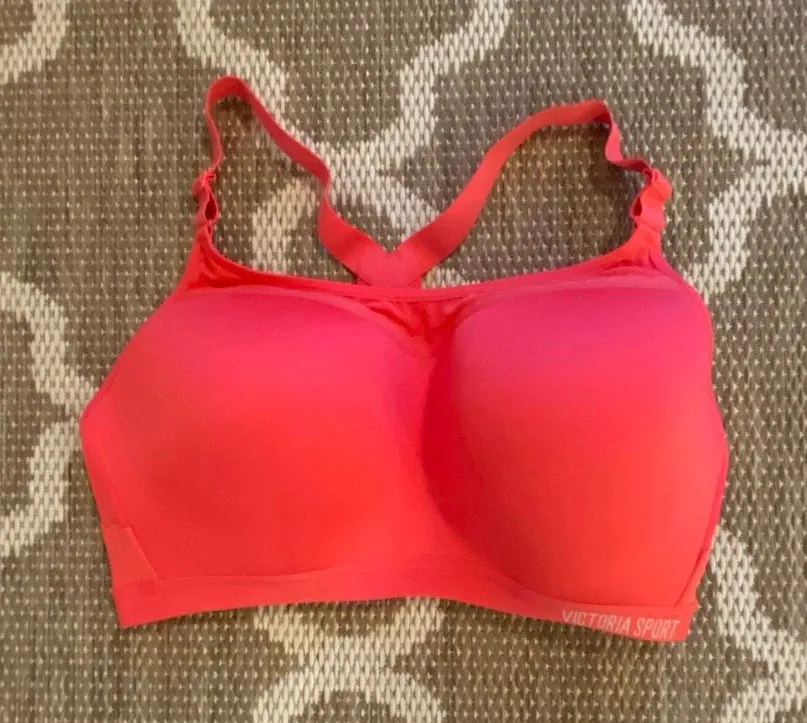 the color is orange more like a coral color. Super cute sports bra. See pictures for more details i... Show more