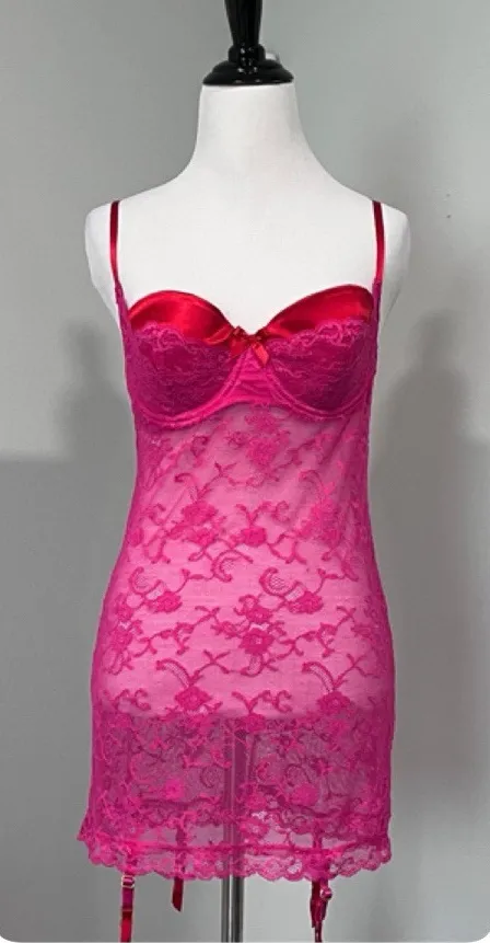 Victorias Secret Lace Bra Garter Slip Dress 36C Y2K Red Pink Lingerie Chemise Nightie Coquette Burle... Show more