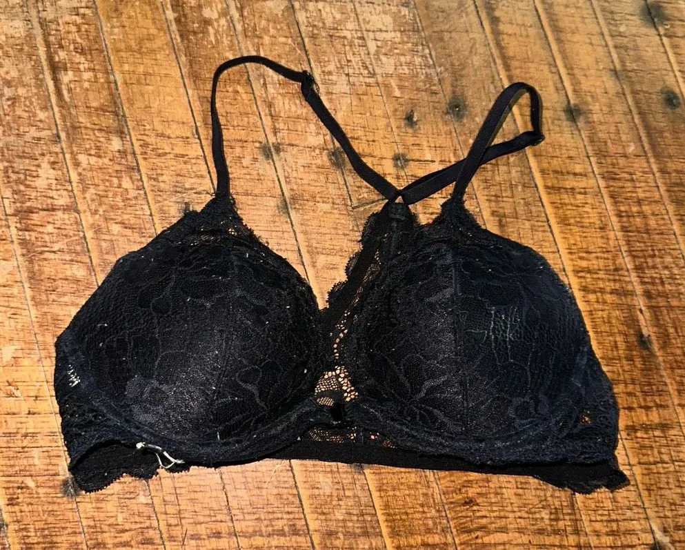 Victoria’s Secret lacy, sexy, front clasp, black, comfortable, racerback bra. Minor wash wear. Overa... Show more