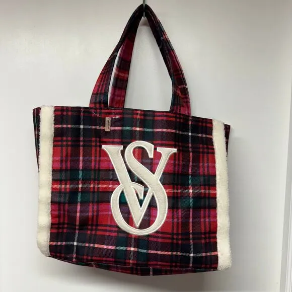 Victorias Secret Large Red Black Plaid Tote Bag Sherpa Trim Big VS Logo NEW - $29 New With Tags - From Heather