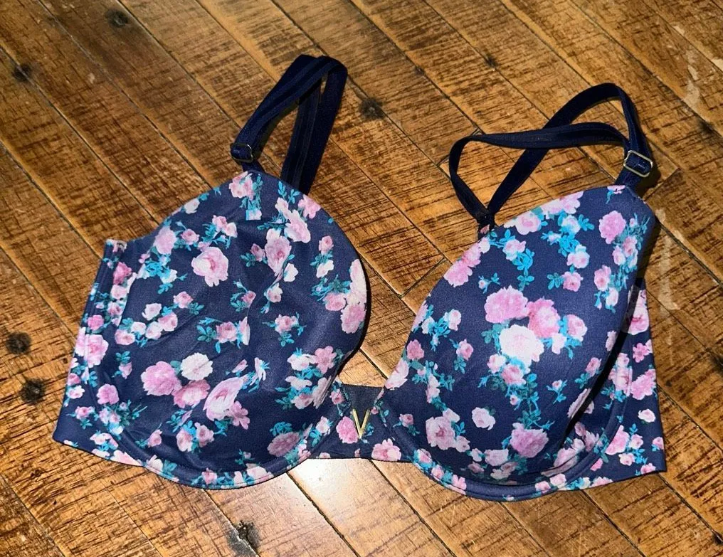 Victoria’s Secret pink rose print, navy background, lined Demi bra. In great shape! Minor wash wear.... Show more