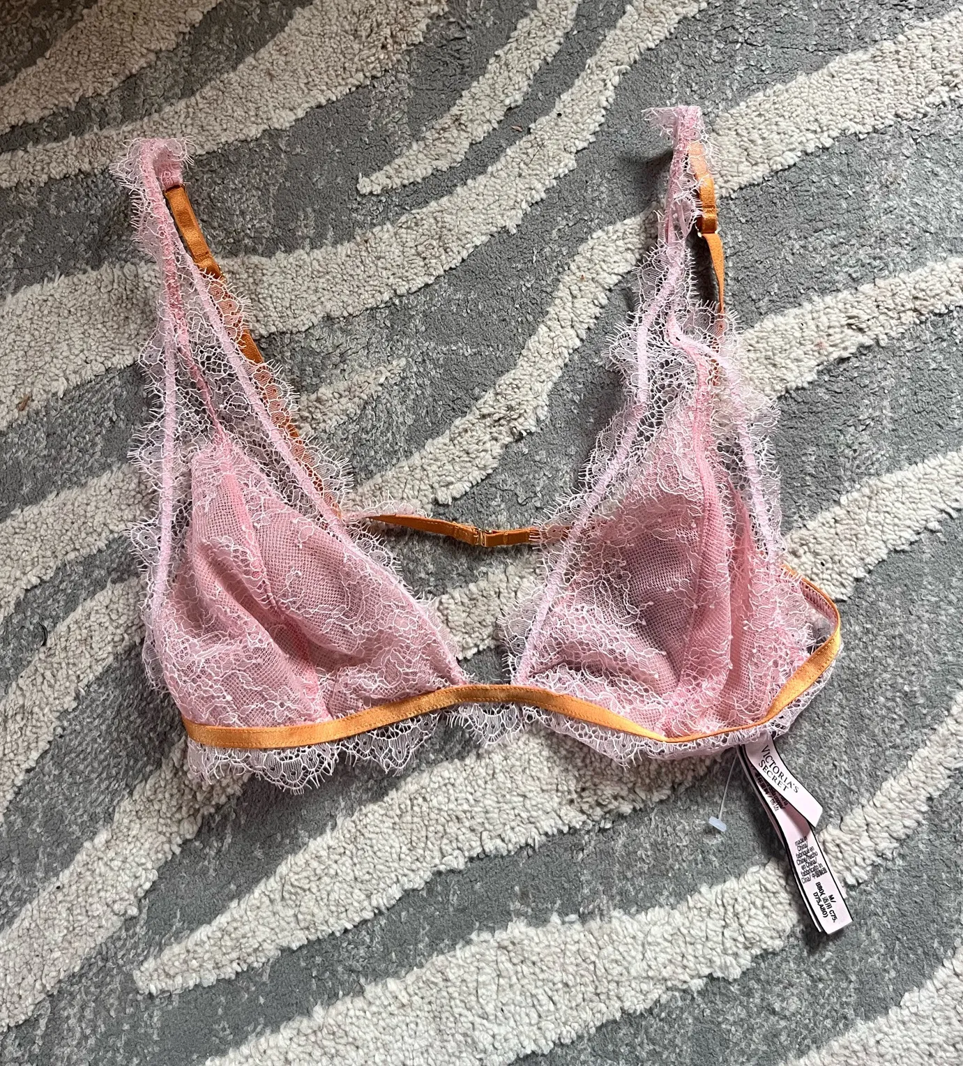 Chic lace bralette with pink fabric and orange trim. Ideal for a stylish intimate look.