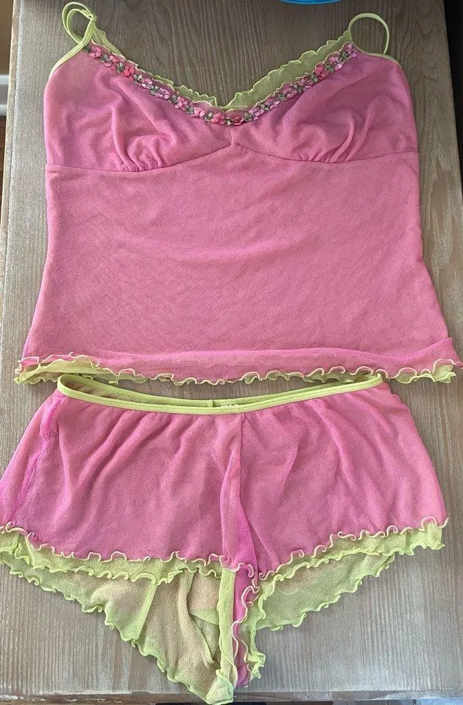 Victoria’s Secret Y2K fairy garden pink/green mesh camisole set, tank top, boy shorts; size S