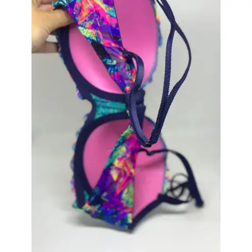 Victoria’s Secret PINK push-up bra in size 32C with neon lace and a colorful abstract print. Padded... Show more