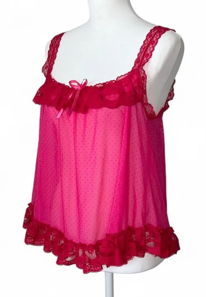 Excellent condition Large Sheer pink mesh with red polka dots, lace and ribbons Sexy little things... Show more
