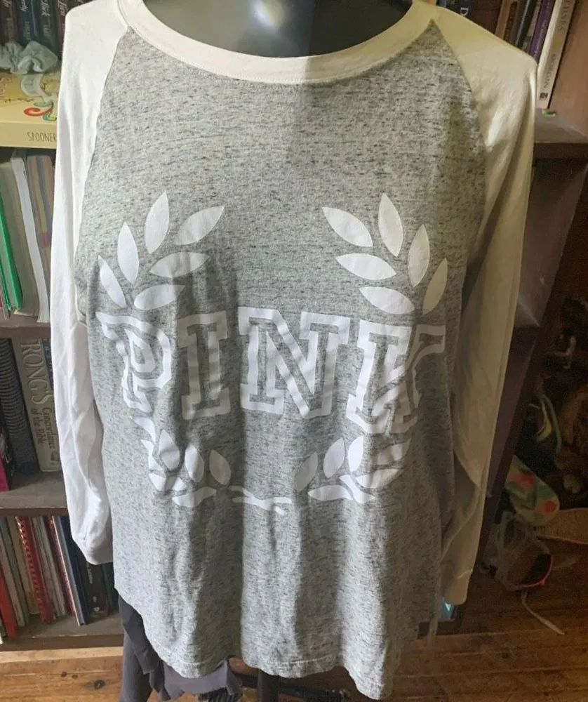 Victoria’s Secret gray and white, relaxed fit, comfortable baseball tee. Minor wash wear. Approximat... Show more
