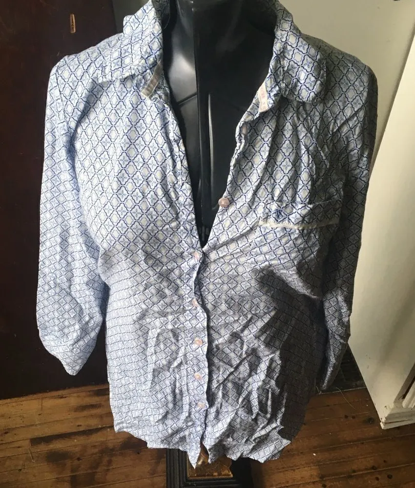 Blue Moroccan design. Button down and collared. Slight discoloring on the collar. Approximately 20 i... Show more