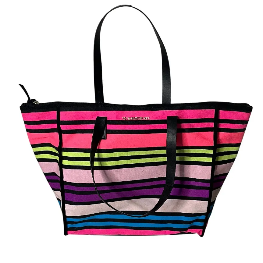 Brightly colored striped tote bag with nylon lining and canvas type fabric exterior. A versatile bag... Show more