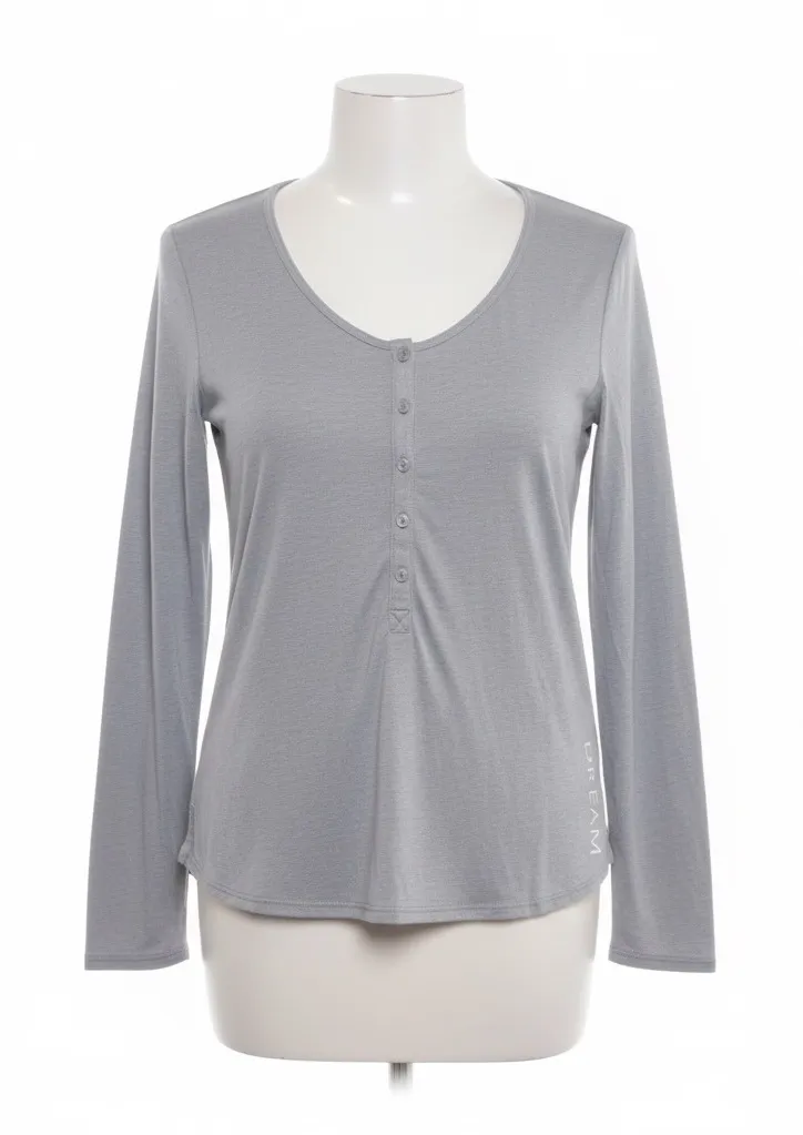 henley, long sleeve, grey shirt, DREAM logo, sleepwear, loungewear, casual top, basic tee, comfortable, neutral, sleep top, pajama top, lounge wear, cozy, comfortable, relaxed fit, weekend, at home, sleep essential