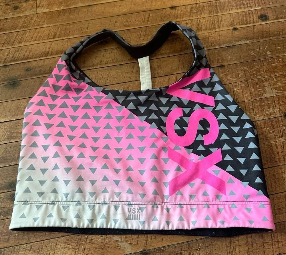 Victoria’s Secret pink and black, sporty, high neck, strappy back, polka dot, wireless, sports bra.... Show more