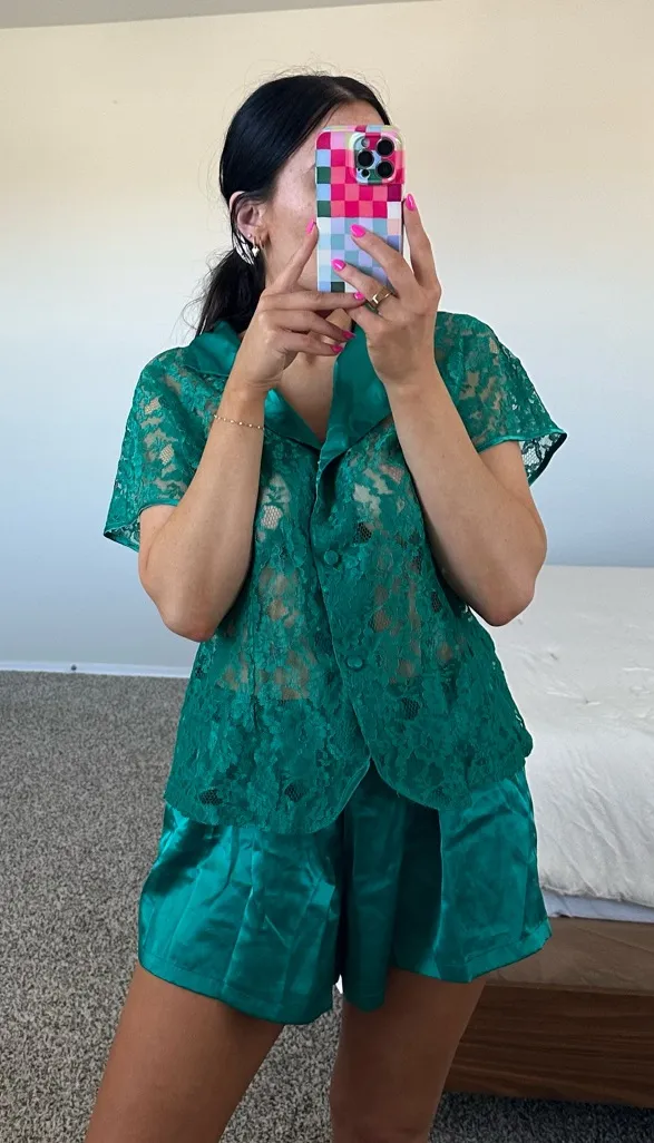 Teal green set Gold tag Lace button up short sleeve Silk shorts Elastic waist So beautiful!! Vintag... Show more