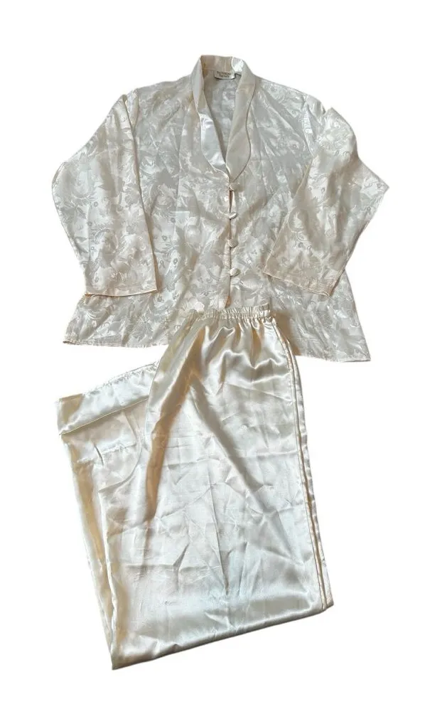 Vintage Victoria Secret Gold Label Ivory Satin Pajamas Set Shirt/Pant 90s Size Medium Shirt Pit to... Show more