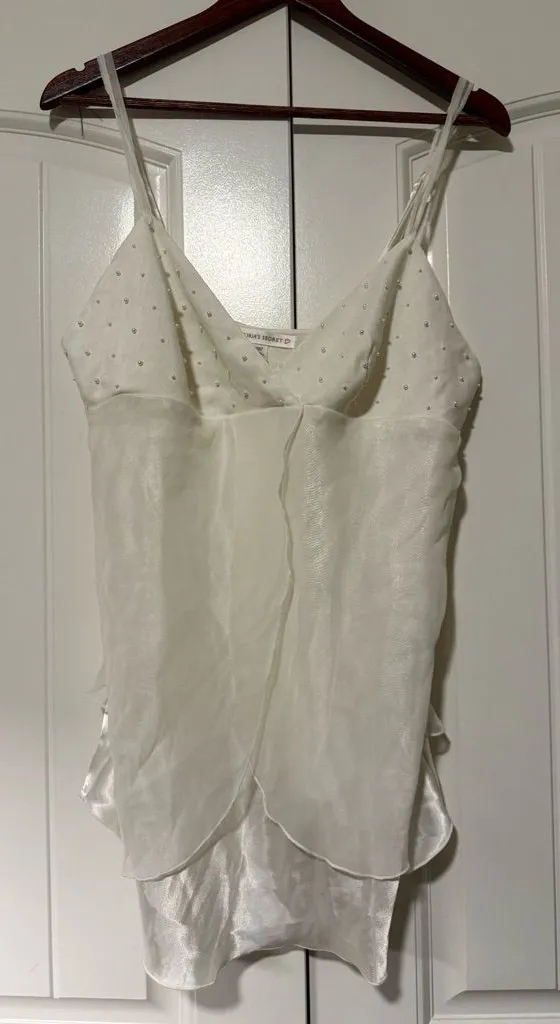 Elegant white camisole with delicate straps. Subtle embellishments on the top. Perfect for layering... Show more