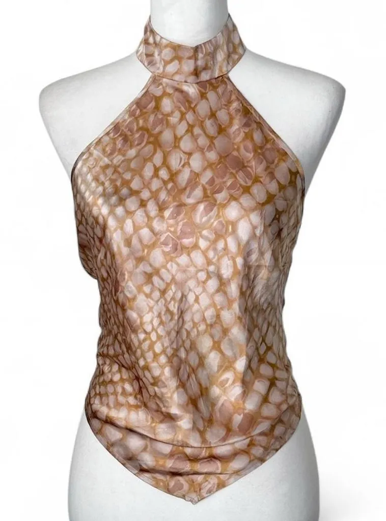 Large, could also fit medium New with tags Snake print 100% silk Halter neck with button closure an... Show more
