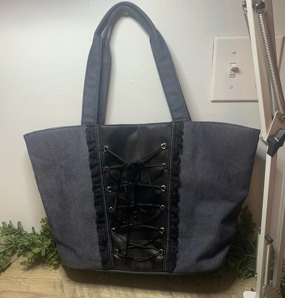 This is a Victoria's Secret denim corset lace-up tote bag. It features a dark blue denim exterior w... Show more