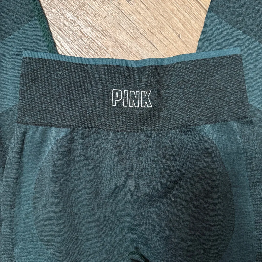 Teal/ emerald green seamless leggings with 'PINK' logo. Soft and flexible. Women’s size small. Measu... Show more