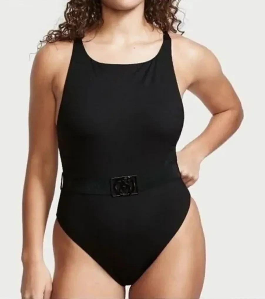 Excellent used condition, worn once. SOLID BLACK RIBBED REMOVABLE PADDING OPEN BACK HIGH LEG CUT A... Show more