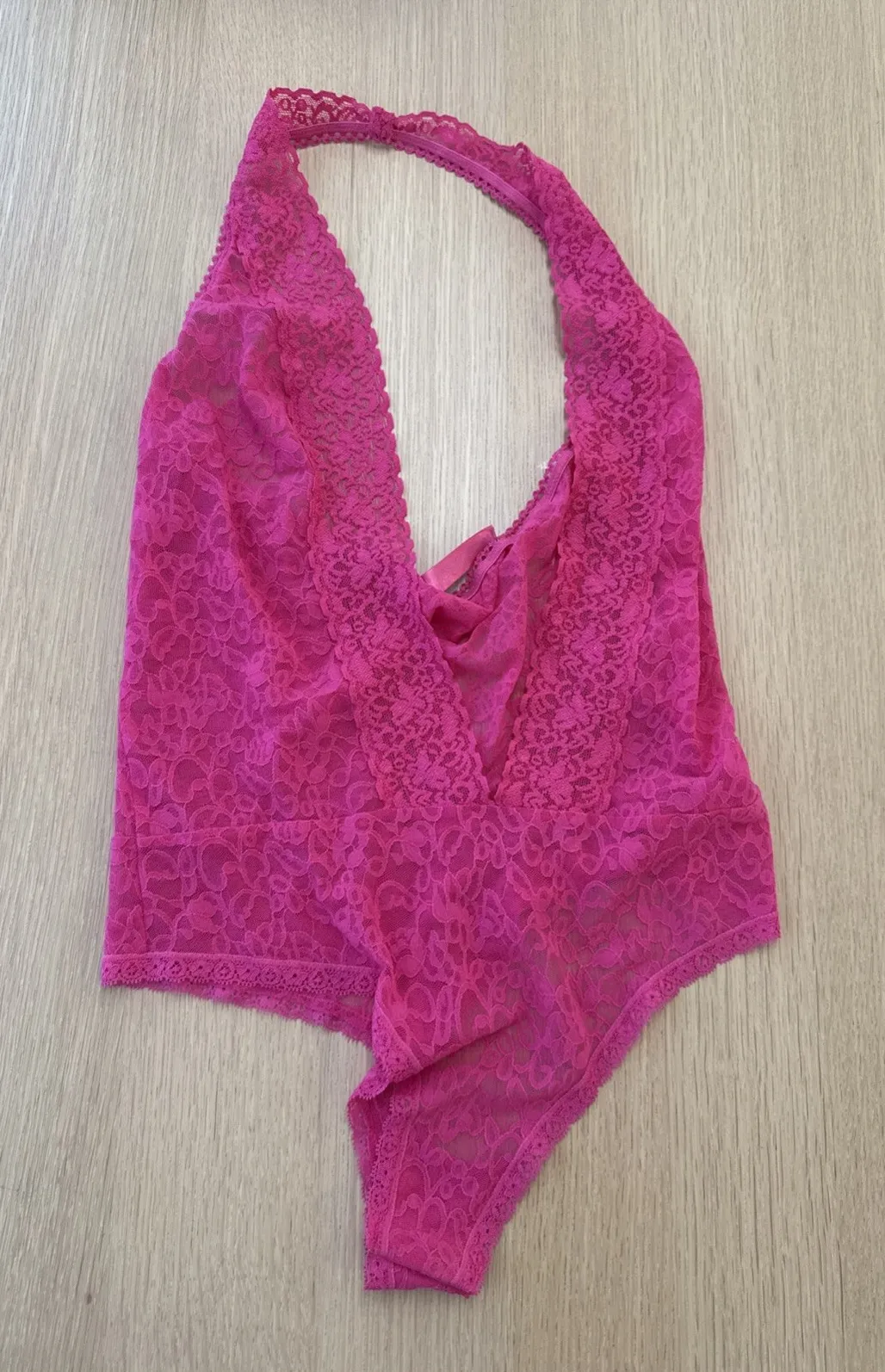 This Y2k Victoria's Secret bodysuit in hot pink size medium features a floral lace pattern, making i... Show more
