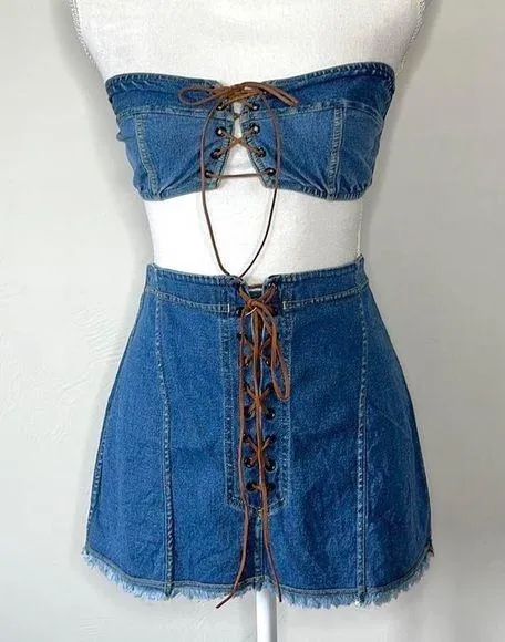 Crop bandeau top MEDIUM Pit to pit 12”-15” Fully adjustable faux suede lace up front Mini skirt SMA... Show more