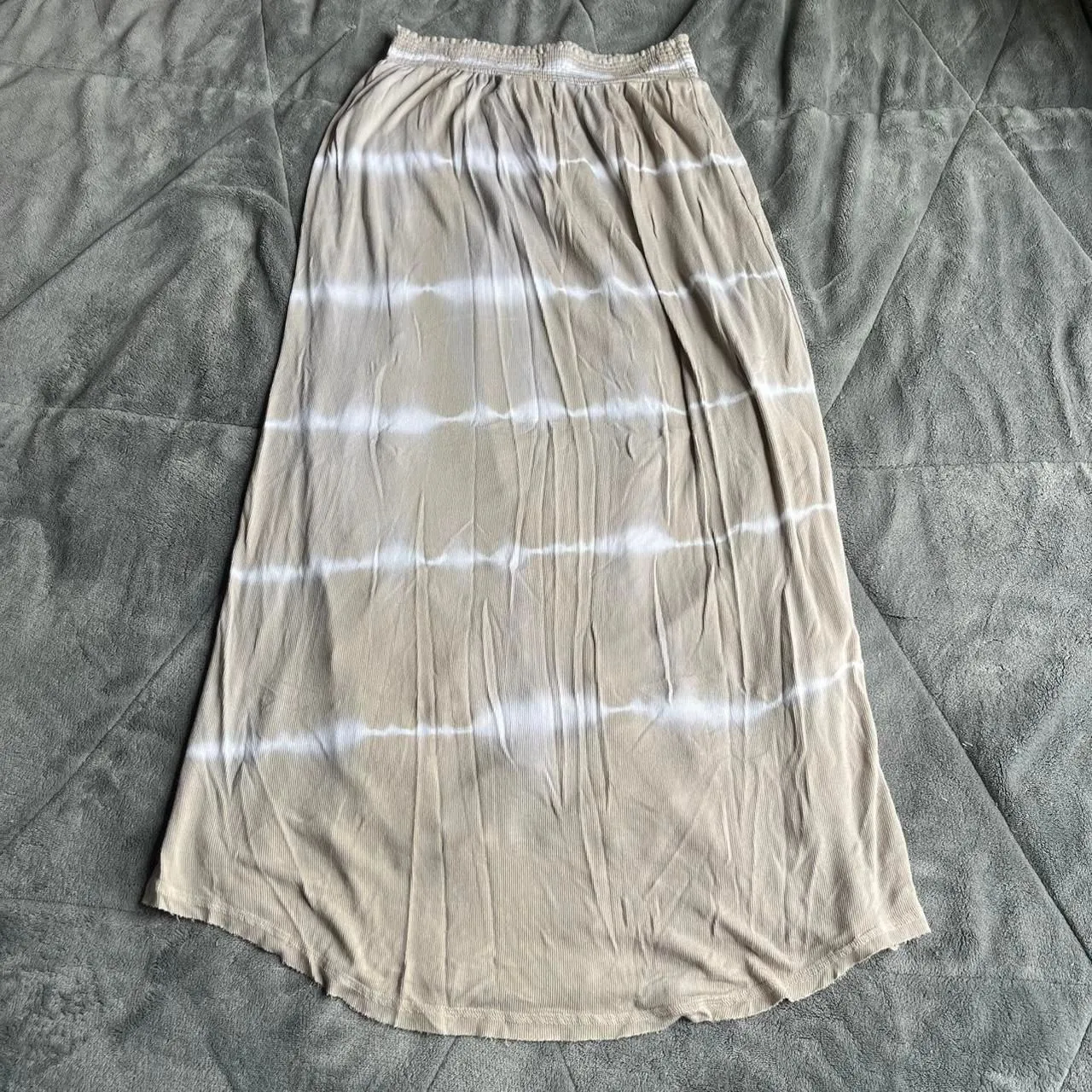 Y2K Victoria’s Secret tan and white tie dye maxi skirt features an elastic waistband and raw hem s... Show more