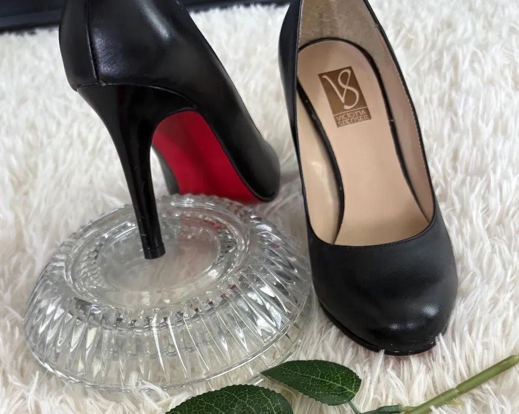 Command attention with these sophisticated black leather pumps, a timeless silhouette radiating elegance. Crafted with a rounded toe, they offer a blend of comfort and classic style, while the striking red soles hint at daring confidence. The supple leather exterior promises durability and a luxurious feel, ensuring these heels become a staple in your wardrobe. With an understated design, these pumps transition seamlessly from high-stakes meetings to elegant evening events, making them perfect for your next cocktail party or a polished business lunch. Worn once Excellent Condition Color: Black Style: Pump Department: Women Upper Material: Leather, Patent Leather Type: Heel Heel Style: Stiletto Toe Shape: Round Toe Heel Height: High (3-3.9 in) Pattern: Solid Closure: Slip On Features: Comfort, Classic, Red Sole, Leather Upper, Round Toe Model: Fountain-S Keywords: black leather pumps, round toe heels, red sole pumps, classic black heels, Victoria Secret shoes, leather heels, black pumps size 6, women's dress shoes, office heels, career pumps, evening pumps, party heels, black stiletto heels