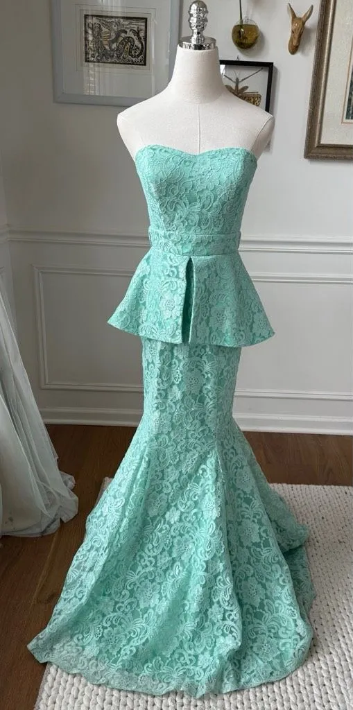 Vienna prom mint green lace fitted peplum waist mermaid cut strapless formal gown. Back zip closure. Retails $550. Molded cups reducing the need for a bra. Laying flat measures 15 inches armpit to armpit with darting to accommodate cup size, 13 inches straight across the Marist and 17 inches across the hip. Laying flat measures 54 inches top to hem.