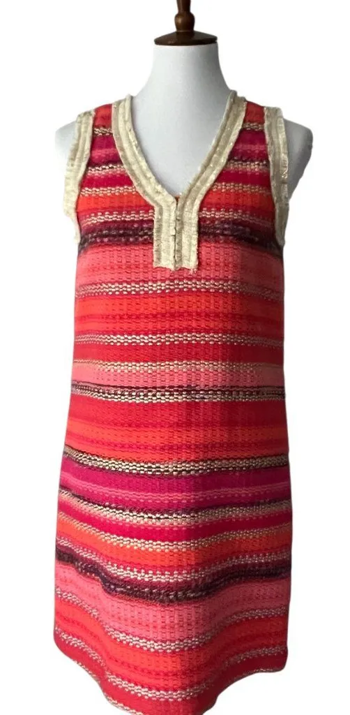 Vilagallo Vibrant Classic Tweed Dress Made in Europe - Portugal Vibrant red, orange, ivory and gold stripe pattern & an ivory and gold fringe trim neckline. Very retro Classic 60s runway style. European Size 40 - US small -Please see photos for approximate measurements. New with Tag - (tag ripped- shows wear) Tag: Luxury Designer Runway Old money vibrant winter Spring colorful sparkle quiet luxury business party Designer Unique Fun Rare Europe