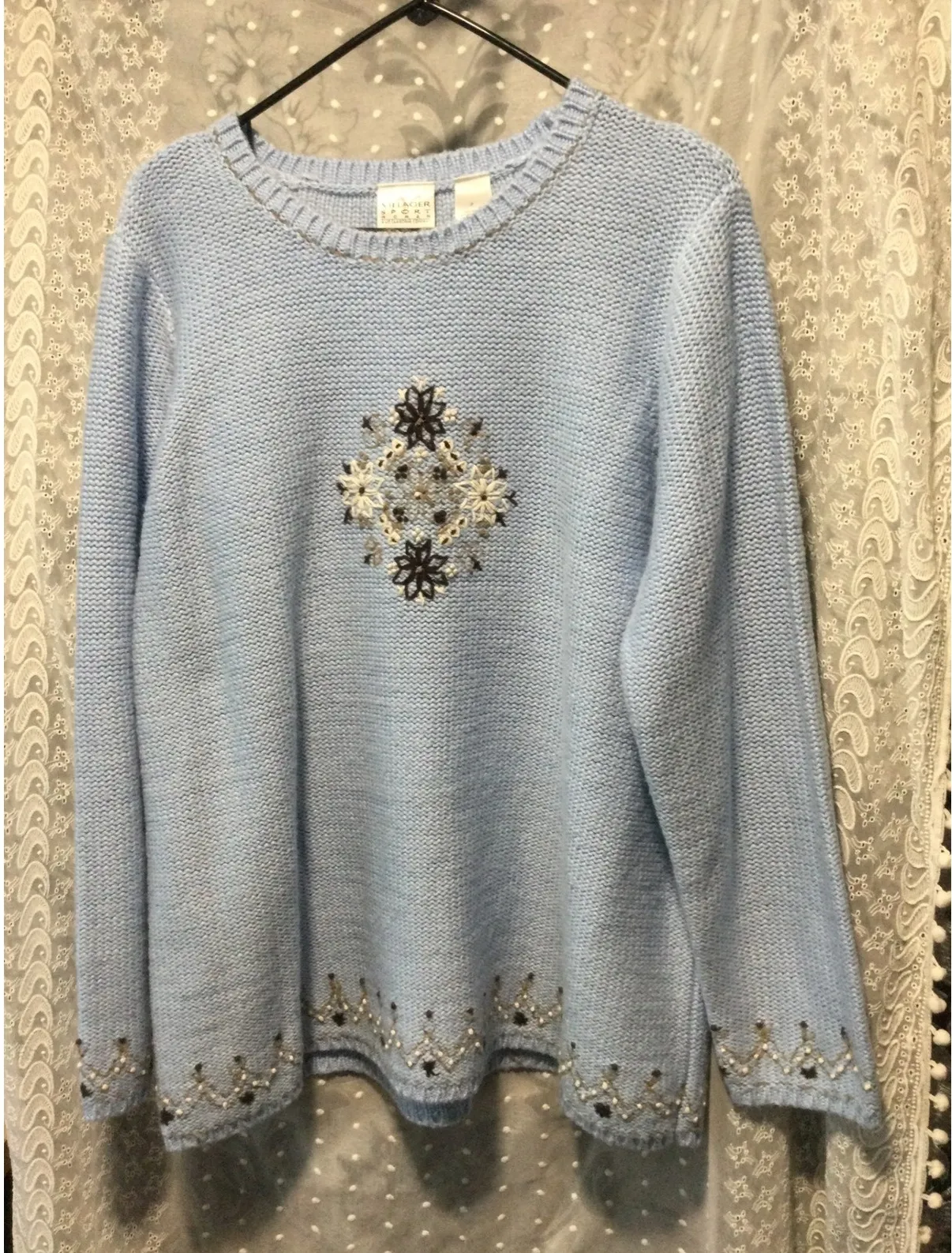 Unlock a world of cozy charm with this Villager Sport knit sweater, a symphony of subtle details that will elevate your everyday style. A light blue canvas forms the backdrop for an exquisite embroidered floral design at the chest, accented by delicate beadwork along the hem that adds a touch of whimsy and elegance. The crew neck offers classic comfort, while the long sleeves ensure warmth on cooler days. This piece is perfect for a casual brunch with friends, a relaxed evening at home, or a stroll through the park on a crisp autumn afternoon. Measurements: • Length: 26 inches • Pit to pit: 24 inches Style: Pullover Color: Blue Department: Women Type: Sweater Material: Acrylic Sleeve Length: Long Sleeve Neckline: Crew Neck Features: Embroidered, Beaded, Knit Pattern: Floral Fabric Type: Knit Accents: Embroidered, Beaded Keywords: Villager Sport, Knit Sweater, Embroidered Sweater, Floral Sweater, Blue Sweater, Womens Sweater, Beaded Sweater, Crew Neck Sweater, Long Sleeve Sweater, Casual Sweater, Vintage Sweater, Classic Sweater