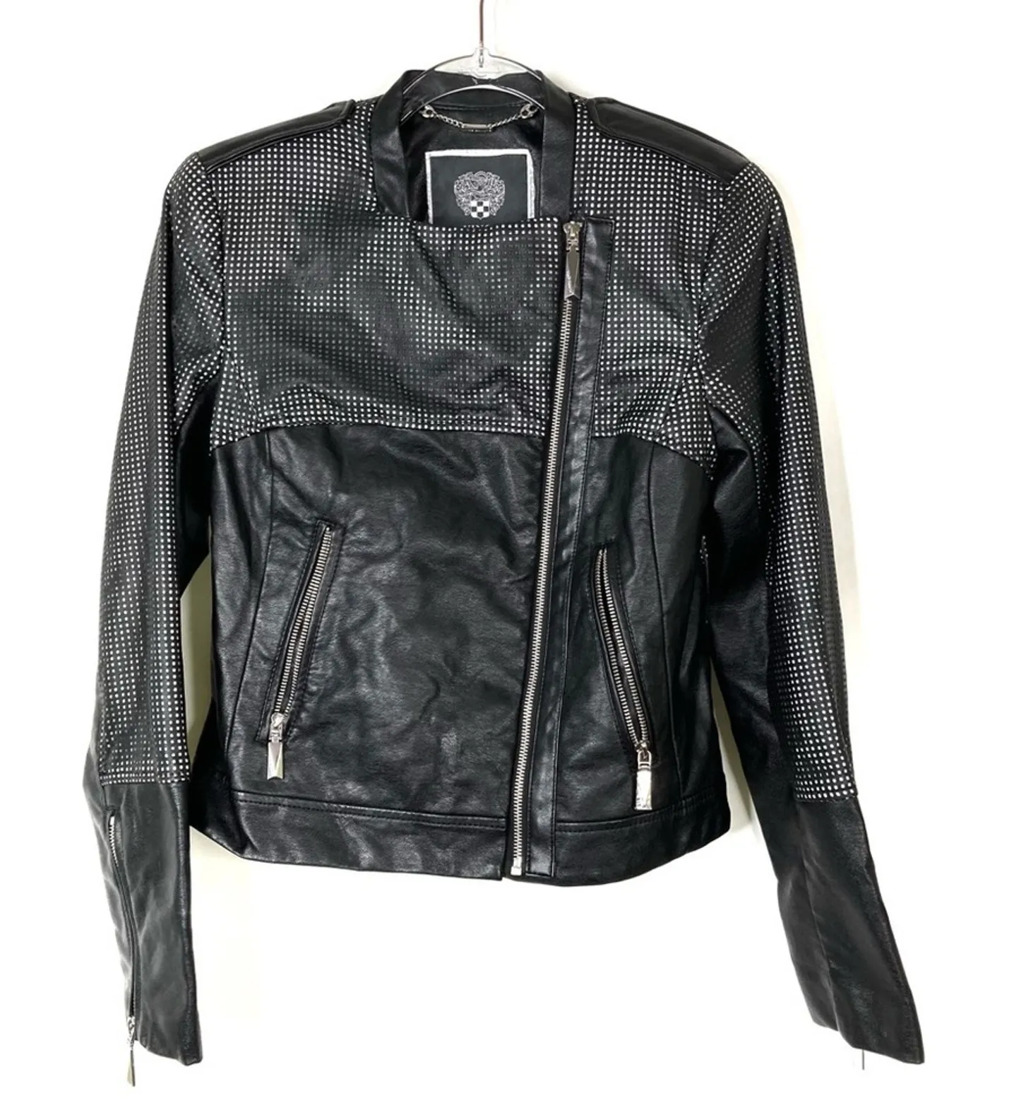 Vince Camuto Faux leather moto jacket Black with checkered cutout detailing Zipper pockets & on sle... Show more