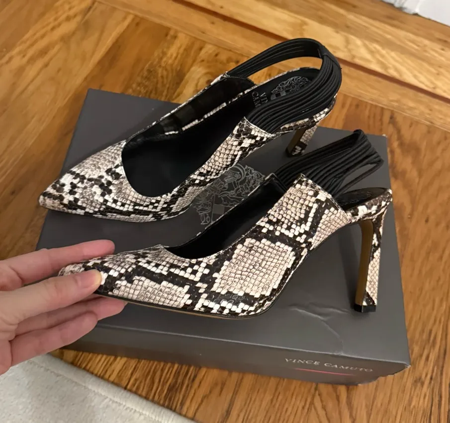 Vince Camuto Delia Black & Cream Snake Print Women's Pointy Toe Slingback Heels Size 6 - $49 New With Tags - From Sophia