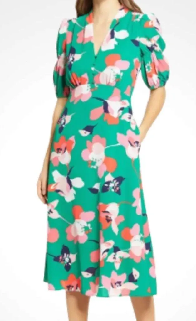 Excellent Condition Vince Camuto Floral Pebble Crepe Midi Dress in Green Size 4 V-neck Button detail... Show more