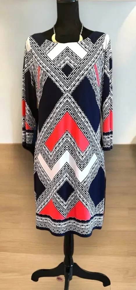 Command attention in this striking Vince Camuto shift dress, a masterpiece of geometric design. The captivating navy, coral, and white pattern creates a dynamic visual effect that is both bold and sophisticated. Its elegant long sleeves and flattering silhouette make it perfect for transitioning from day to night, exuding confidence and modern flair. Ideal for a sophisticated brunch, a stylish work event, or an evening out with friends.