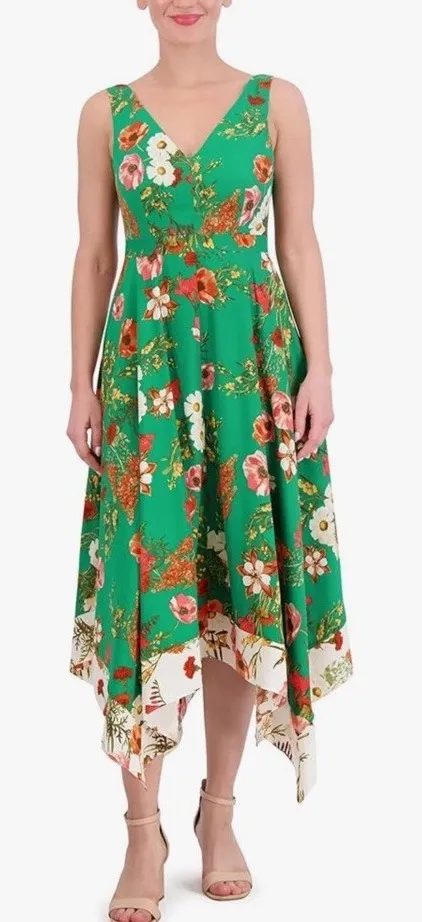 Softly tailored of floral-print crepe de chine, this bright dress features an eye-catching handkerch... Show more