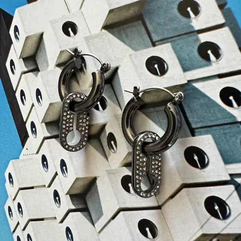These earrings feature a striking hematite-tone finish with chunky hoop design and dangle drop accen... Show more